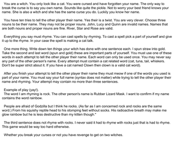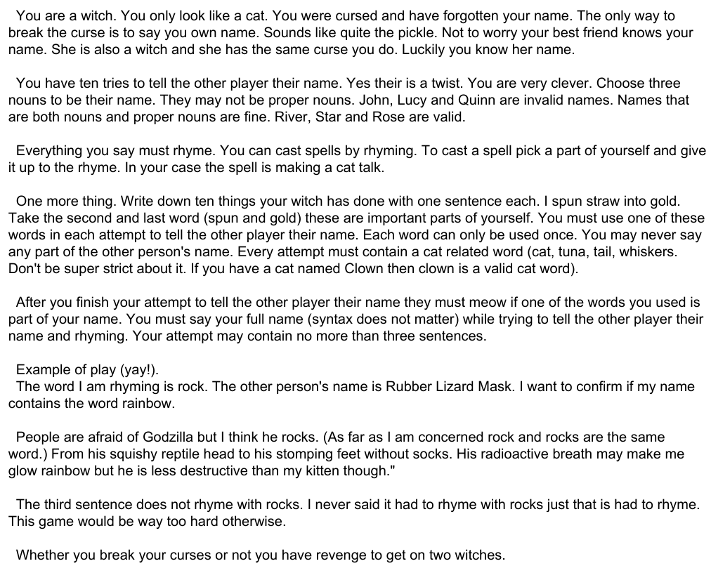 You are a witch that was cursed to become a cat. That is not important. Your best friend was also cursed and needs your help. It would be a lot easier if you didn't have to rhyme all the time.